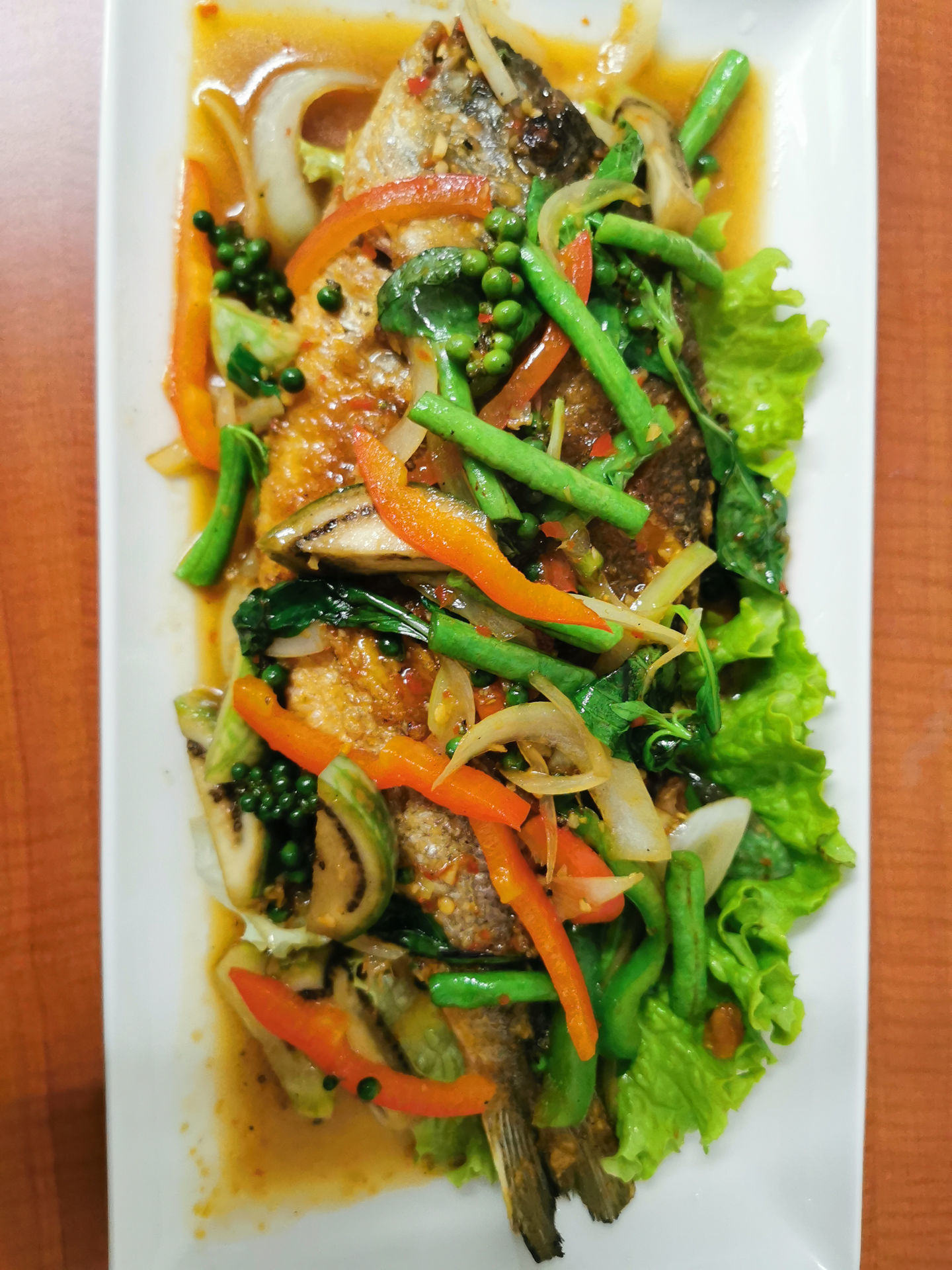 Daurade pimentées sautées au wok avec de feuilles de basilic thai