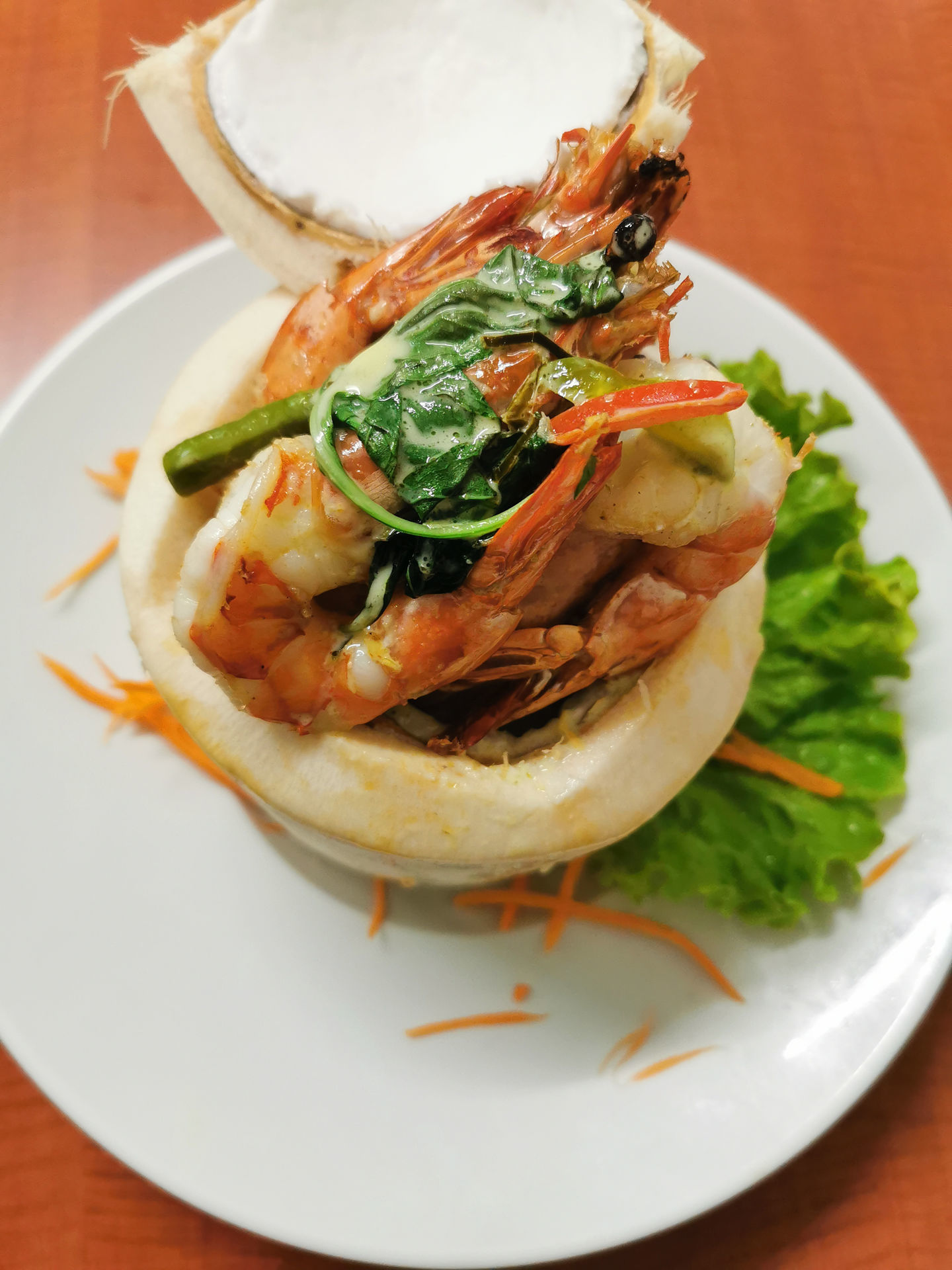 Gambas au curry vert cuisinées dans un jeune coco frais