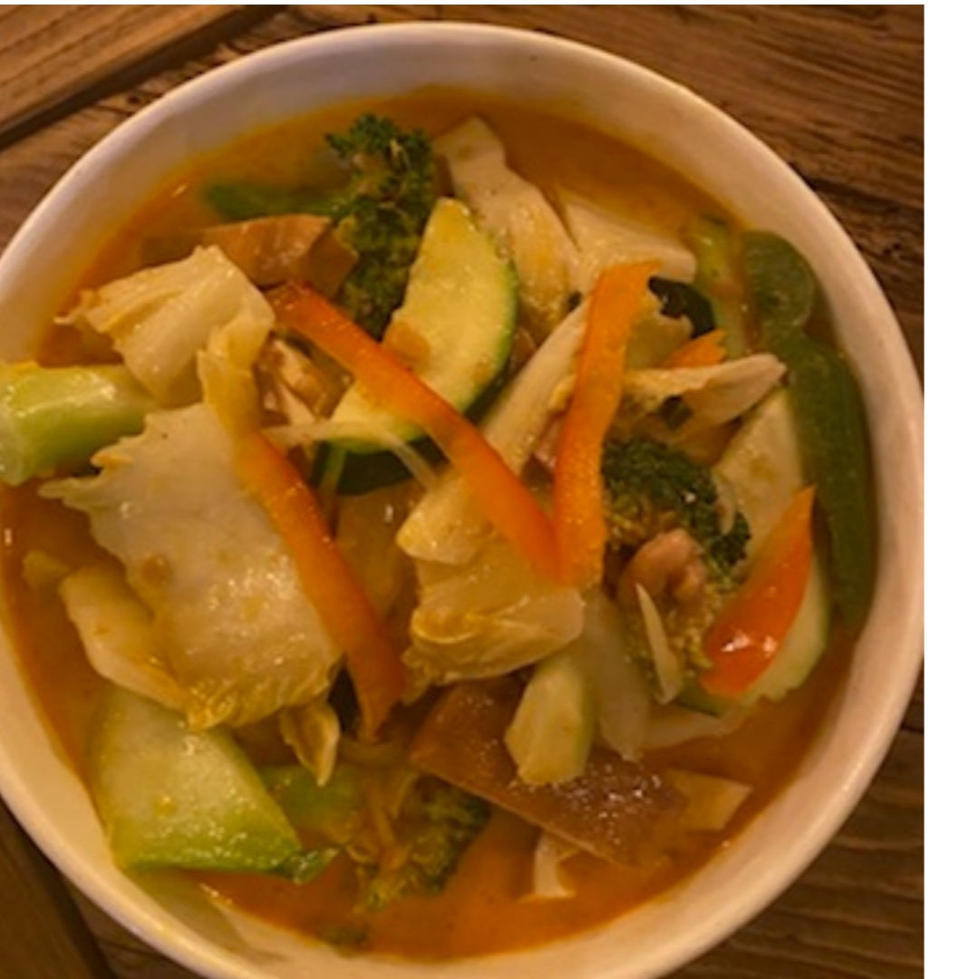 Légumes au curry rouge à la crème de coco et cacahuètes,tofu frit et fumé